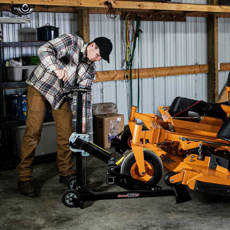 The MoJack 750 XT Riding Mower Lift is designed to lift any riding mower or lawn tractor on the market, including zero turning radius models. The 750 XT is ideal for blade sharpening, belt replacement, and debris removal. Safer and more convenient than car ramps or blocks, it features a screw jack and safety-lock pin system to prevent the machine from slipping or becoming unstable while performing repair and maintenance. You can also add the MoJack Workbench attachment, which is great for work on push mowers and other small projects. The MoJack 750 XT Riding Mower Lift can be raised with a drill and can be folded flat for storage.