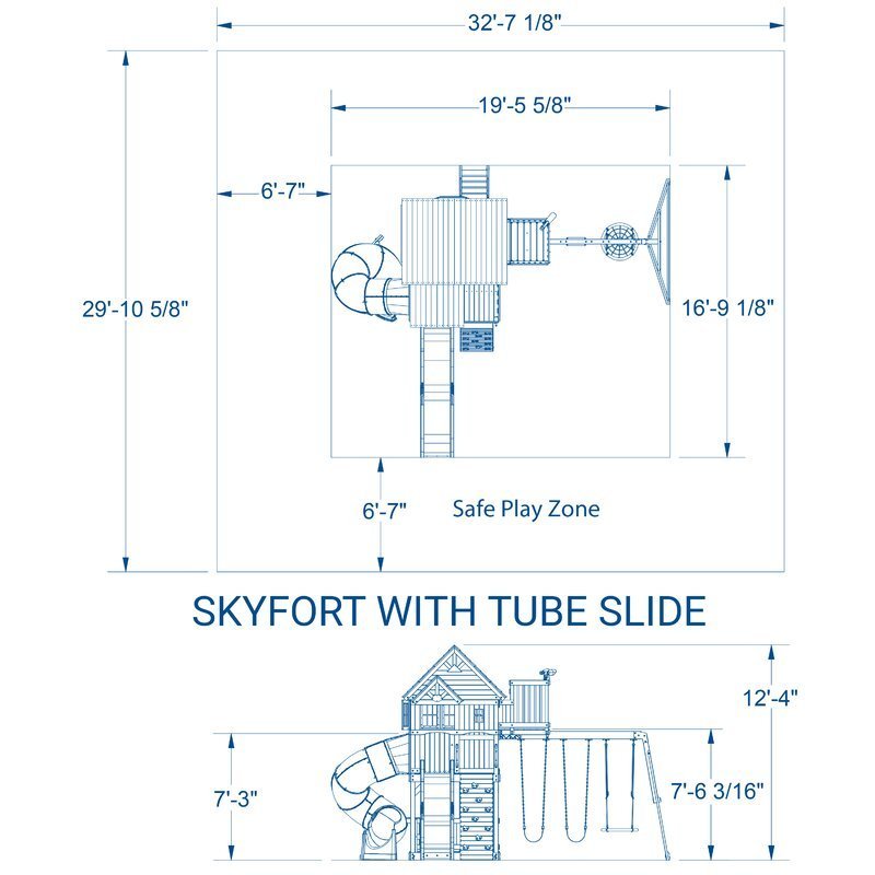 The Skyfort swing set by Backyard Discovery will elevate your children锟斤拷s imaginations while providing countless hours of fun on its many outdoor play options. With over 12 different features, this cedar two-toned wooden playset is packed with activities for your children and their friends, guaranteed to challenge their physical abilities as well as help develop important cognitive and social skills. Unique to the Skyfort playset is an elevated crow锟斤拷s nest and telescope that will spark an outdoor adventure into any child. This expansive wood swing set offers a 3-position swing beam including, 2 heavy-duty 26-inch belt swings and a large web swing with the capacity to let 3 kids swing at once. Our patented swing beam extender offers wider swinging lanes for added safety. The 5-foot rock wall will give older kids the climbing challenge they need and the flat-step ladder will give even the youngest kids a safe way to climb into the upper fort. The fully covered upper clubhouse offers protection from the elements with a full wooden roof and accent windows. When everyone is done climbing, they can slide down the 10-foot wave slide or 5-foot spiral tube slide and relax on the covered picnic table in the lower fort. The Skyfort wooden swing set is everything you need in an outdoor playground, right in your own backyard.What's Included