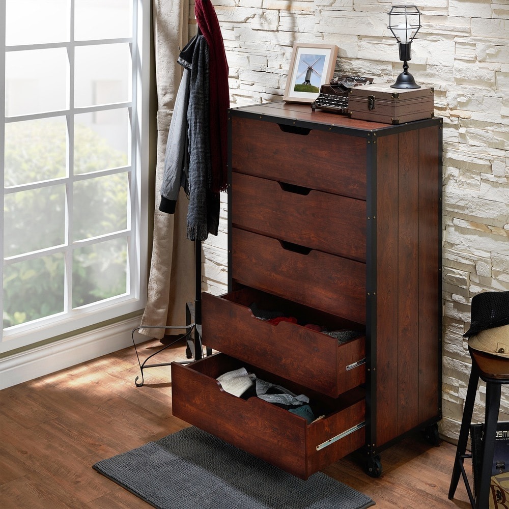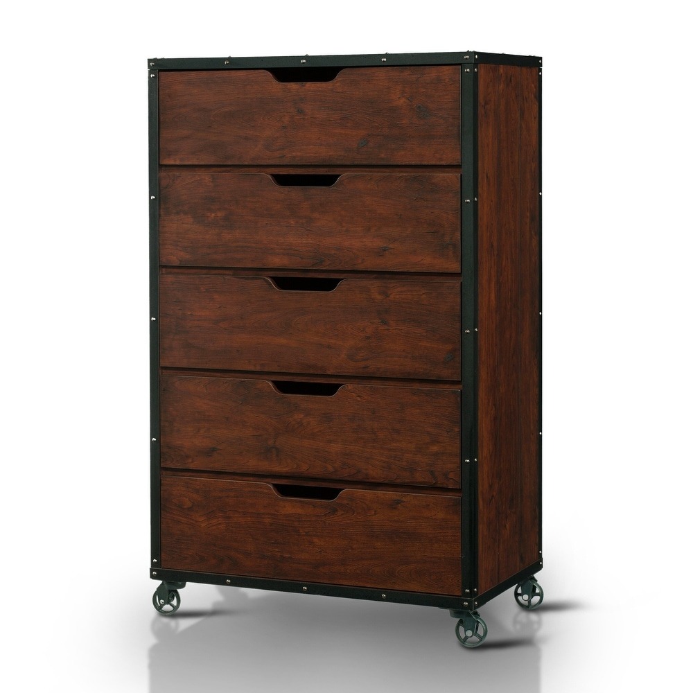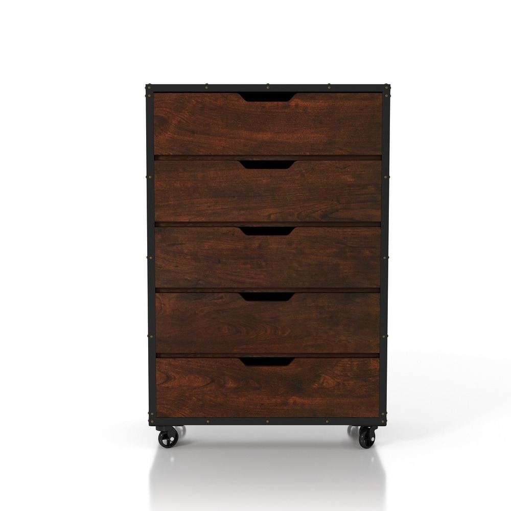 Vertical side slats bring a charming rustic vibe to this tall five-drawer chest from the Furniture of America Aurville collection. Complete with a vintage walnut wood finish that lends a handsome design aesthetic, this chest offers smart versatility along with a masculine style. Each spacious drawer offers plenty of room to store apparel and accessories, easily accessible with a cut-out handles and fitted on smooth metal glides that add the functionality. With a trunk-like look, this chest of drawers features metal-wrapped edges for an industrial style effect, accented with nailhead rivets, as well as metal casters that allow for mobility and room transitions.