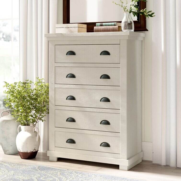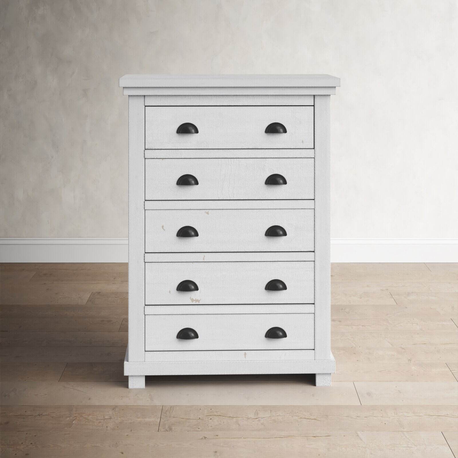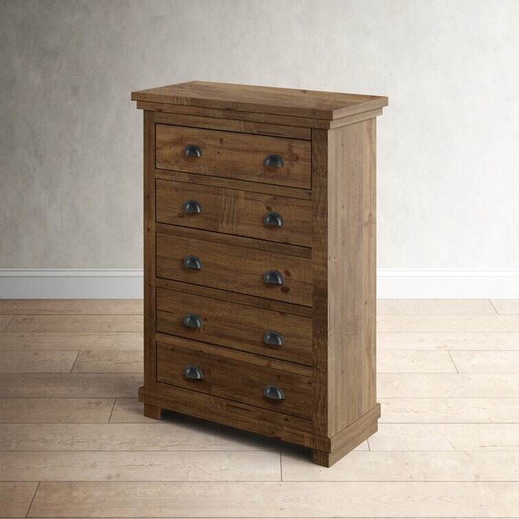 Crafted from salvaged pine wood, this clean-lined five-drawer chest brings storage and a touch of well-worn charm to your master suite or guest room. Its five drawers provide plenty of space for your wardrobe or spare linens, while a distressed finish and tasteful cup pull ensure this design is just as stylish as it is practical. This piece arrives fully assembled with a tip-over restraint strap included, giving you an option for added stability.