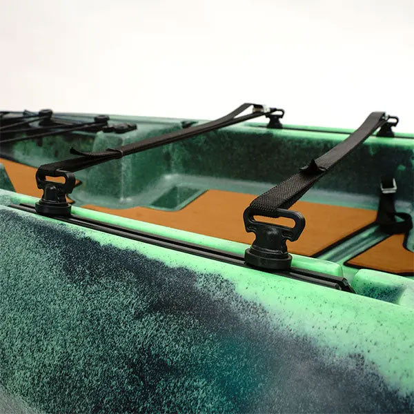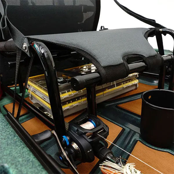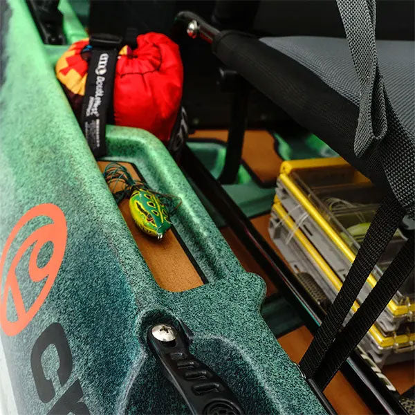 The cockpit of the CK2 Venture has ample leg room with adjustable foot tracks for paddlers of all sizes. This model comes standard with a full teak pad kit that pairs beautifully with the Moss colorway for added comfort, noise reduction, and aesthetics. The High Chair is fully adjustable and comfortable with an extra 2.5" of closed-cell foam padding. Dual Stash Trays, cupholders, YakAttack GearTracs, and ample room under the seat provide all of the necessary room for your gear and essentials.