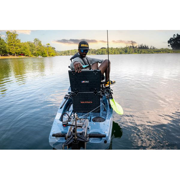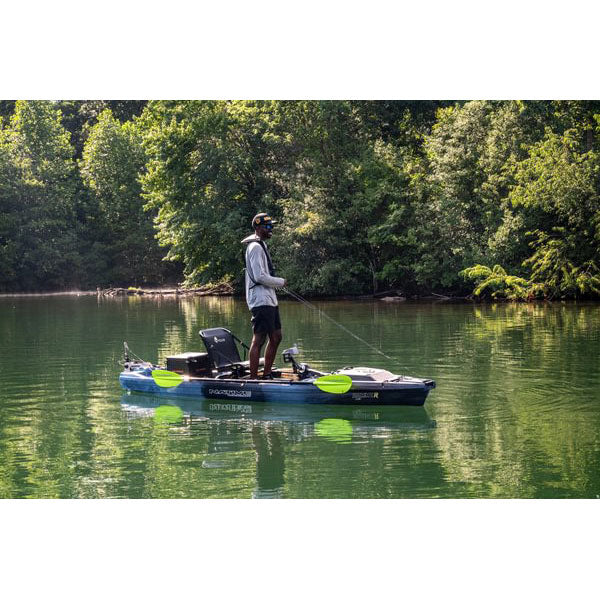 Anglers will appreciate the spacious, padded standing deck and smartly placed storage areas. There’s side tackle box storage, flush-mount and forward-facing rod holders, and a PivotPro seat with an integrated tackle tray. The kayak is also foot-steering ready and compatible with the Wizard Steering System, making it even easier to control while using a motor or drifting in current. Additional features include skid plates for added durability, side storage compartments, in-hull access, and readiness for the Sidekick Wheel System.