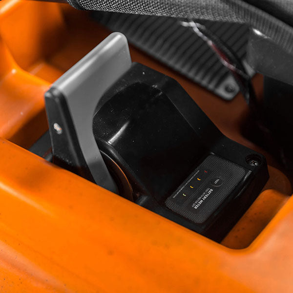- Powerboat style throttle for intuitive forward and reverse. Built-in battery meter