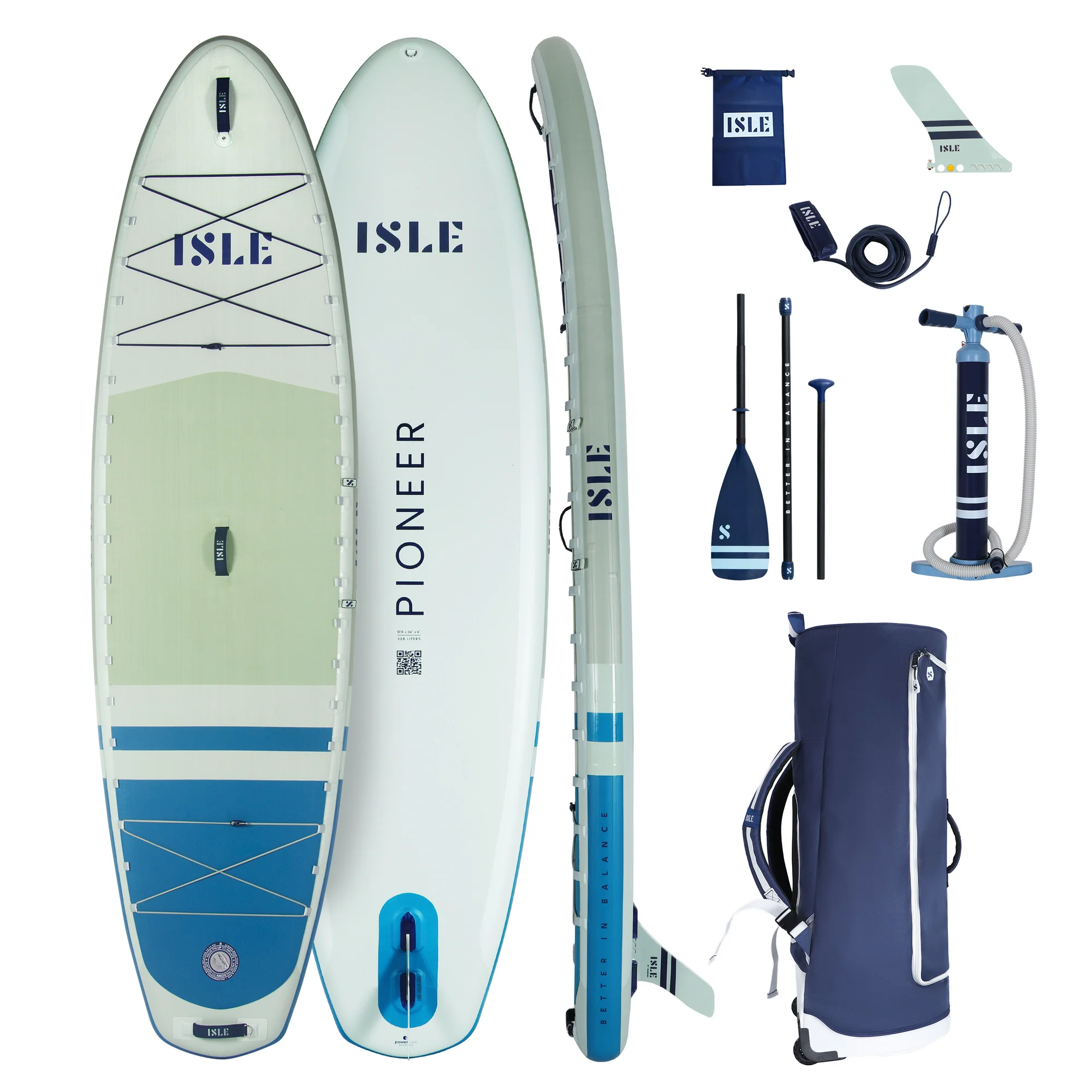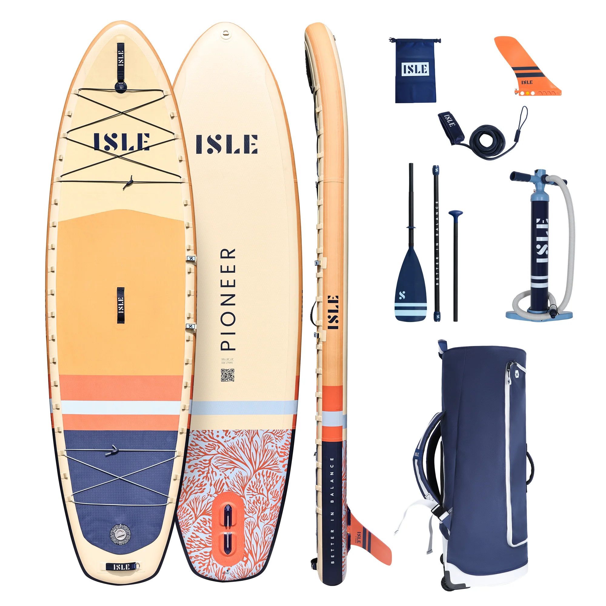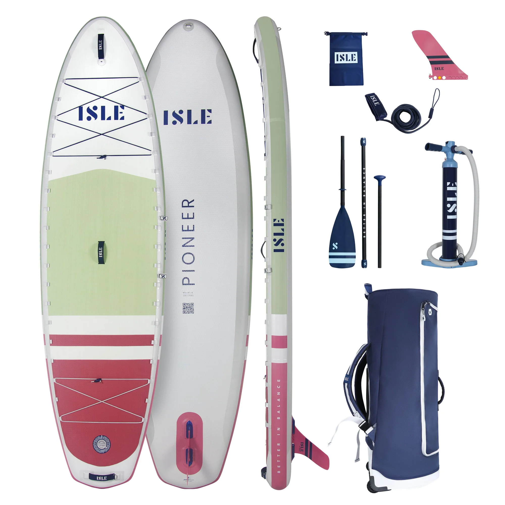 The board features a nose and tail handle for easy two-person carrying, as well as a center handle for solo transport. The reinforced lay-flat grab handles simplify transporting the board, even when loaded with gear, along riverbeds, docks, or shore breaks. Its lay-flat design makes it perfect for yoga, lounging, and placing gear over handles.