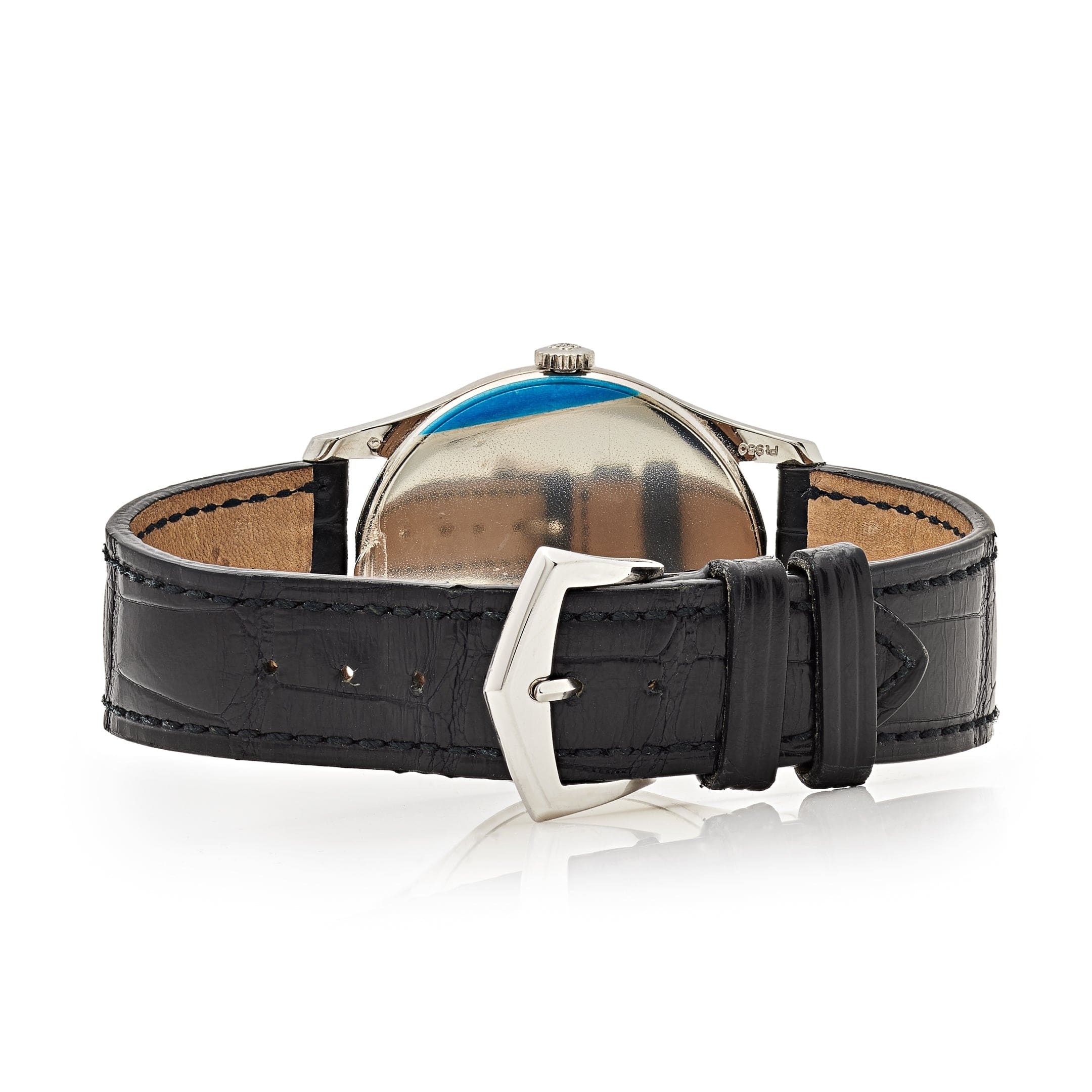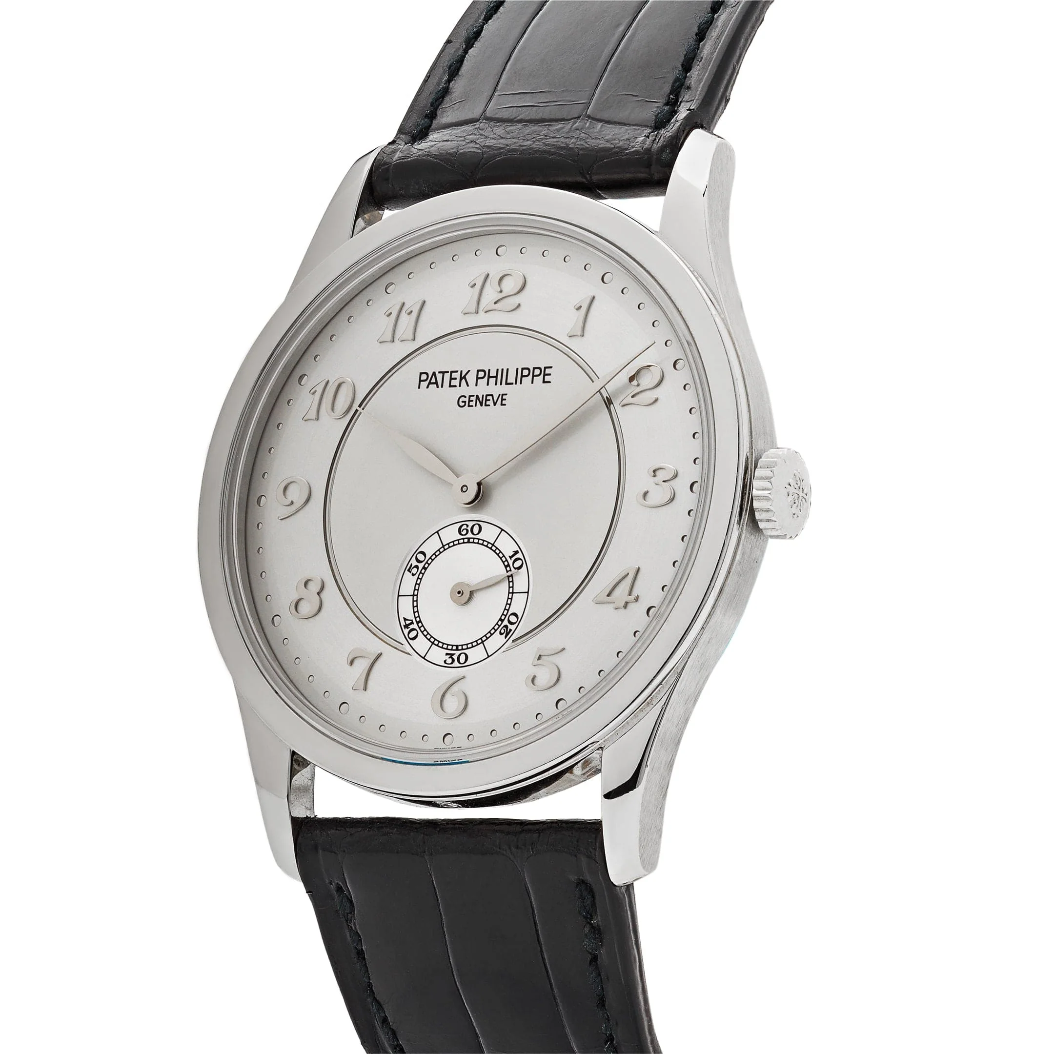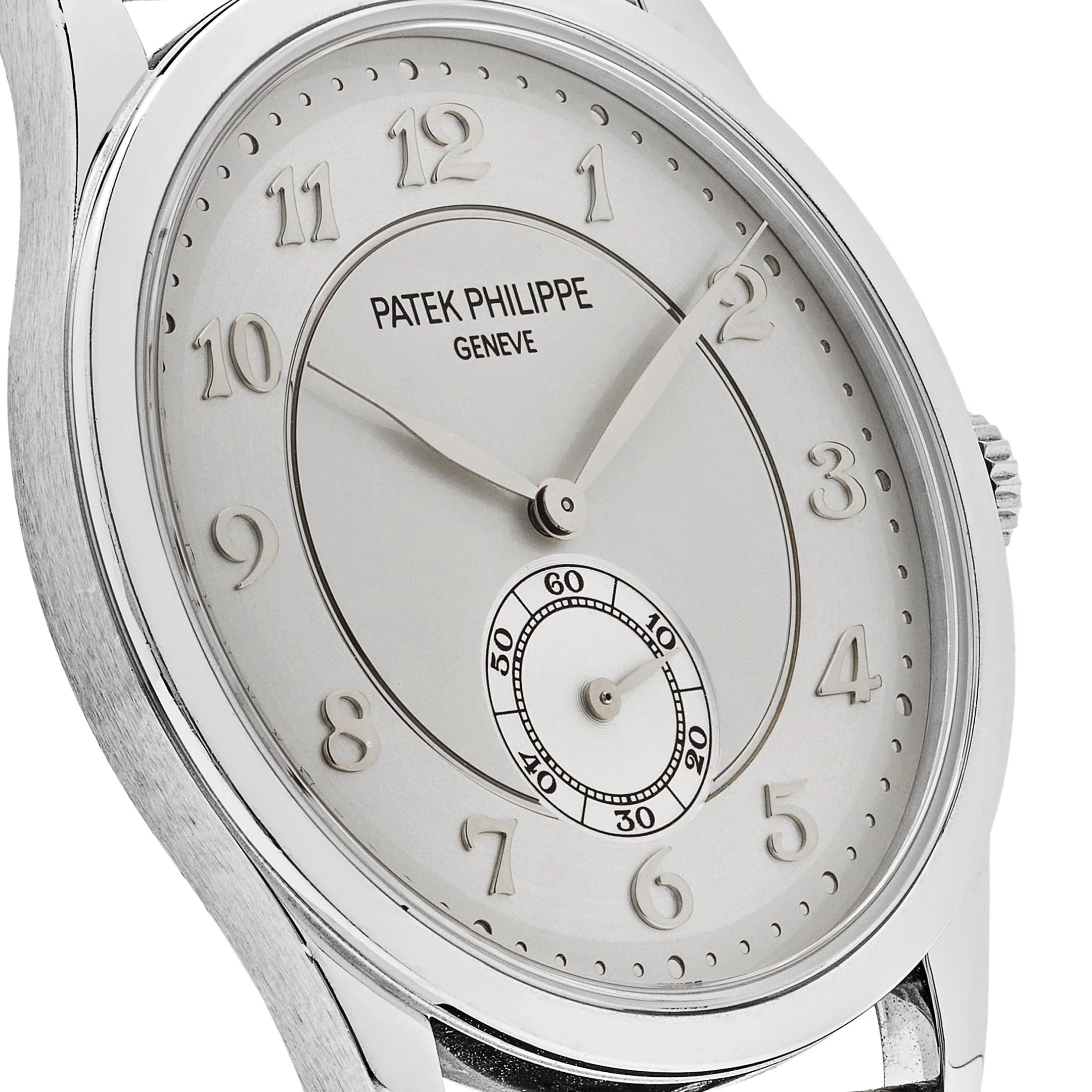 The Patek Philippe Calatrava is designed in a 37mm platinum case and styled on a leather strap. Complications include hours, minutes, and small seconds. This sleek�and sophisticated dress watch is the next addition to your collection.��