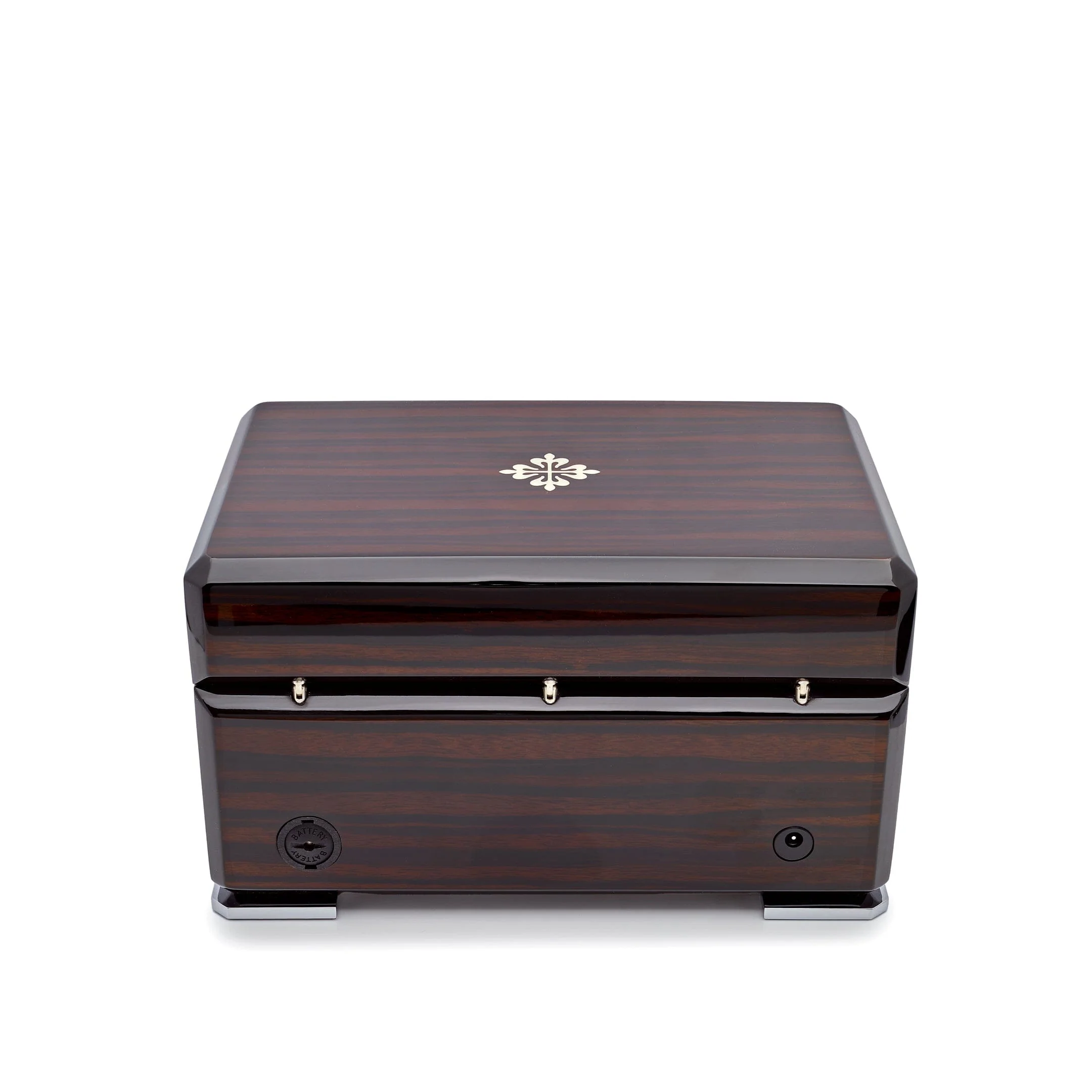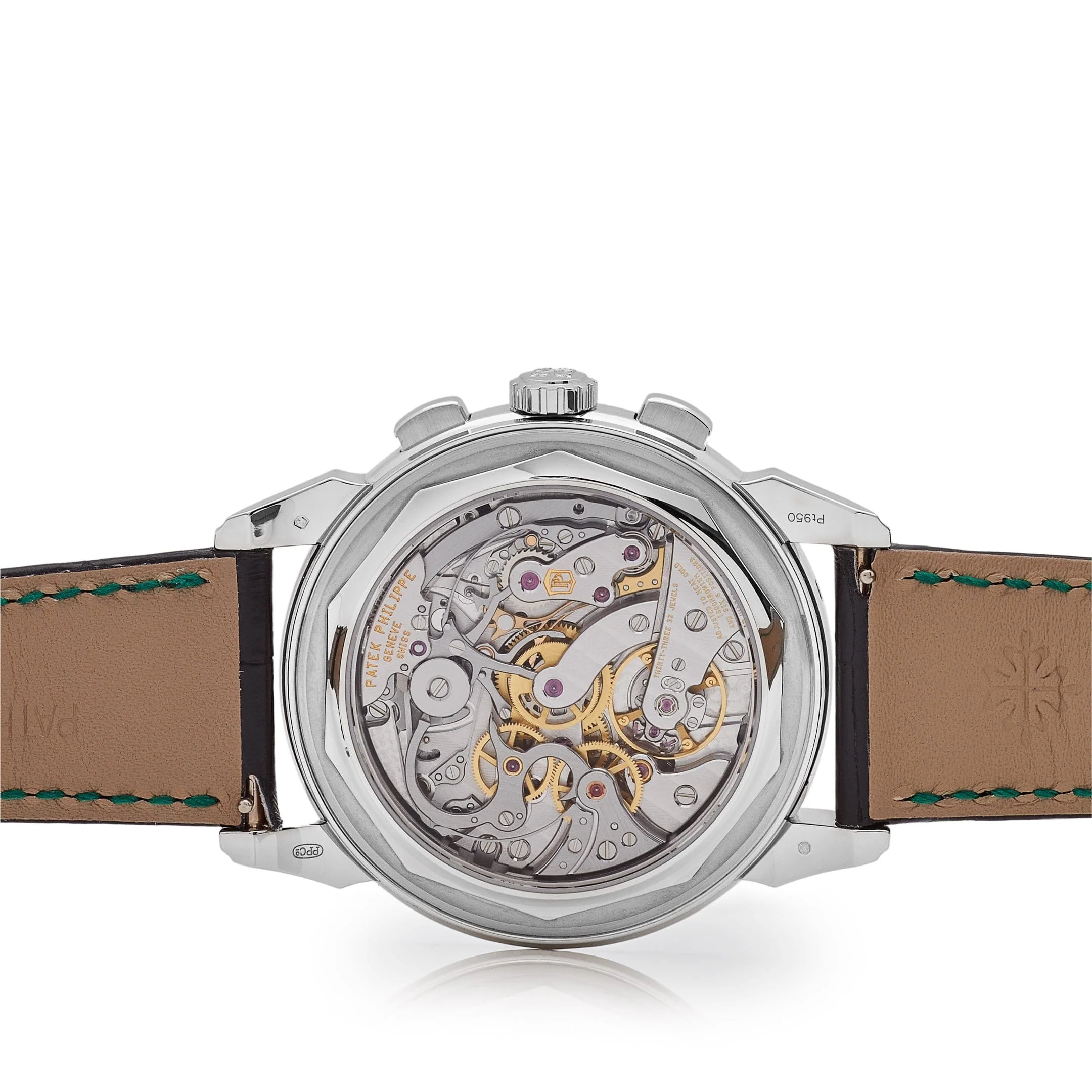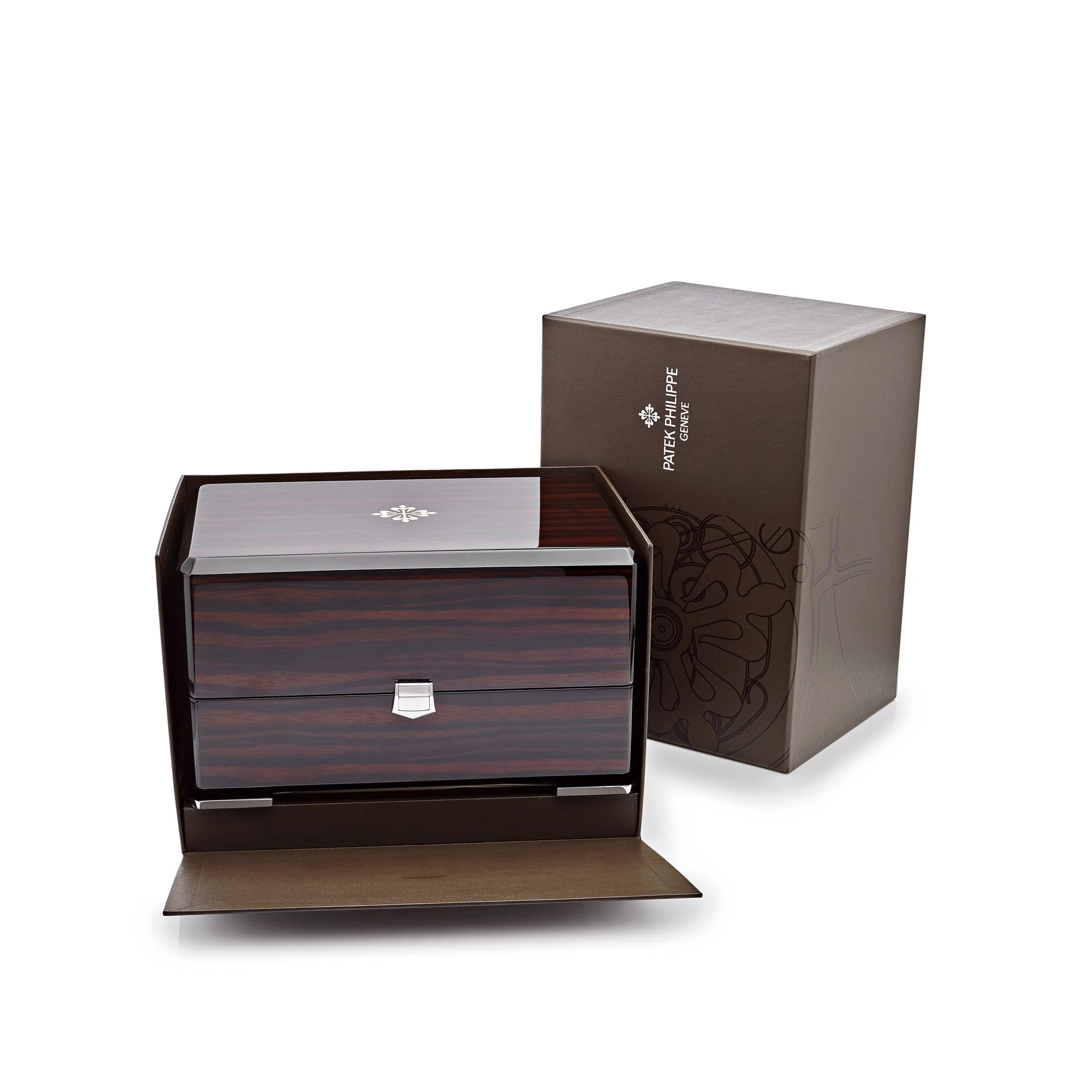 This Patek Philippe Chronograph is crafted in a platinum case measuring 41mm in diameter. The concave bezel surrounds a laquered green dial featuring a black-gradient rim and gold applied hour markers. The perpetual calendar displays are harmoniously arranged, with the date indicated by a hand and a moon phase at 6 o’clock, as well as a twin day/month aperture at 12 o’clock, complemented by two round apertures for the day/night indication and the leap-year cycle. The watch comes on a black alligator leather strap with a fold over clasp.