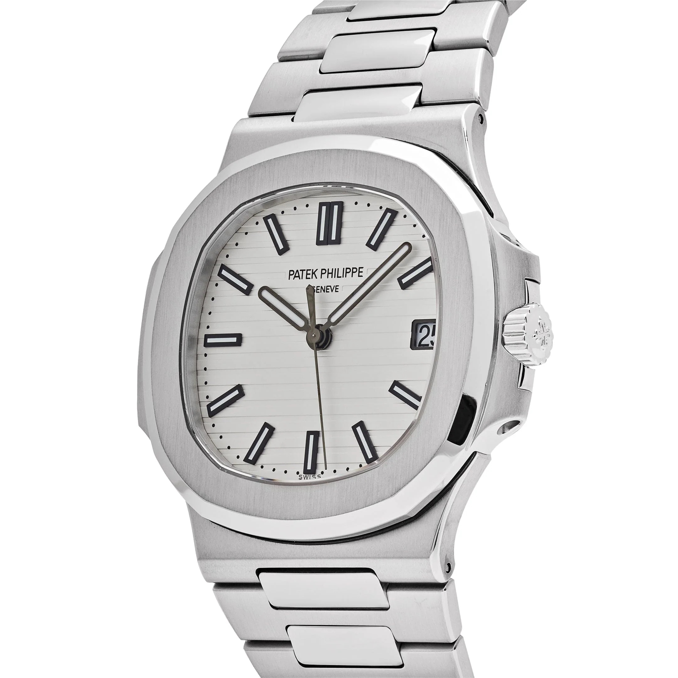 This Patek Philippe Nautilus timepiece features a 40mm stainless steel case surrounding an embossed silvery-white dial with luminous hours and hands. It is finished on a stainless steel bracelet and fold-over clasp. This watch features the 324 S movement.