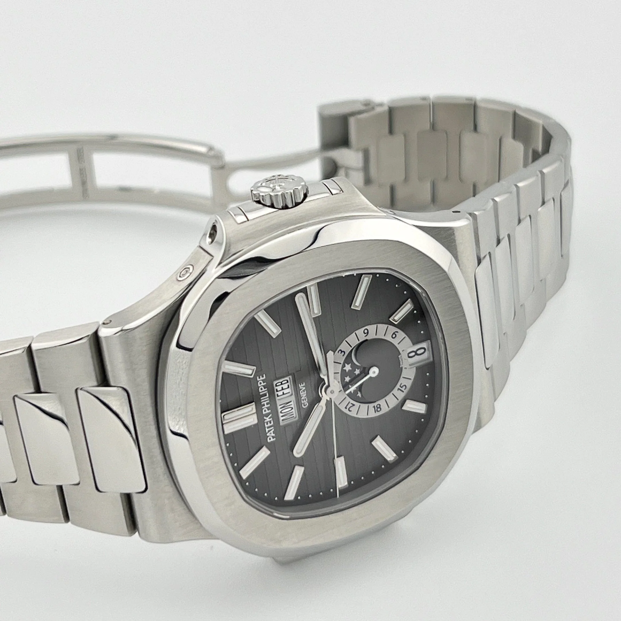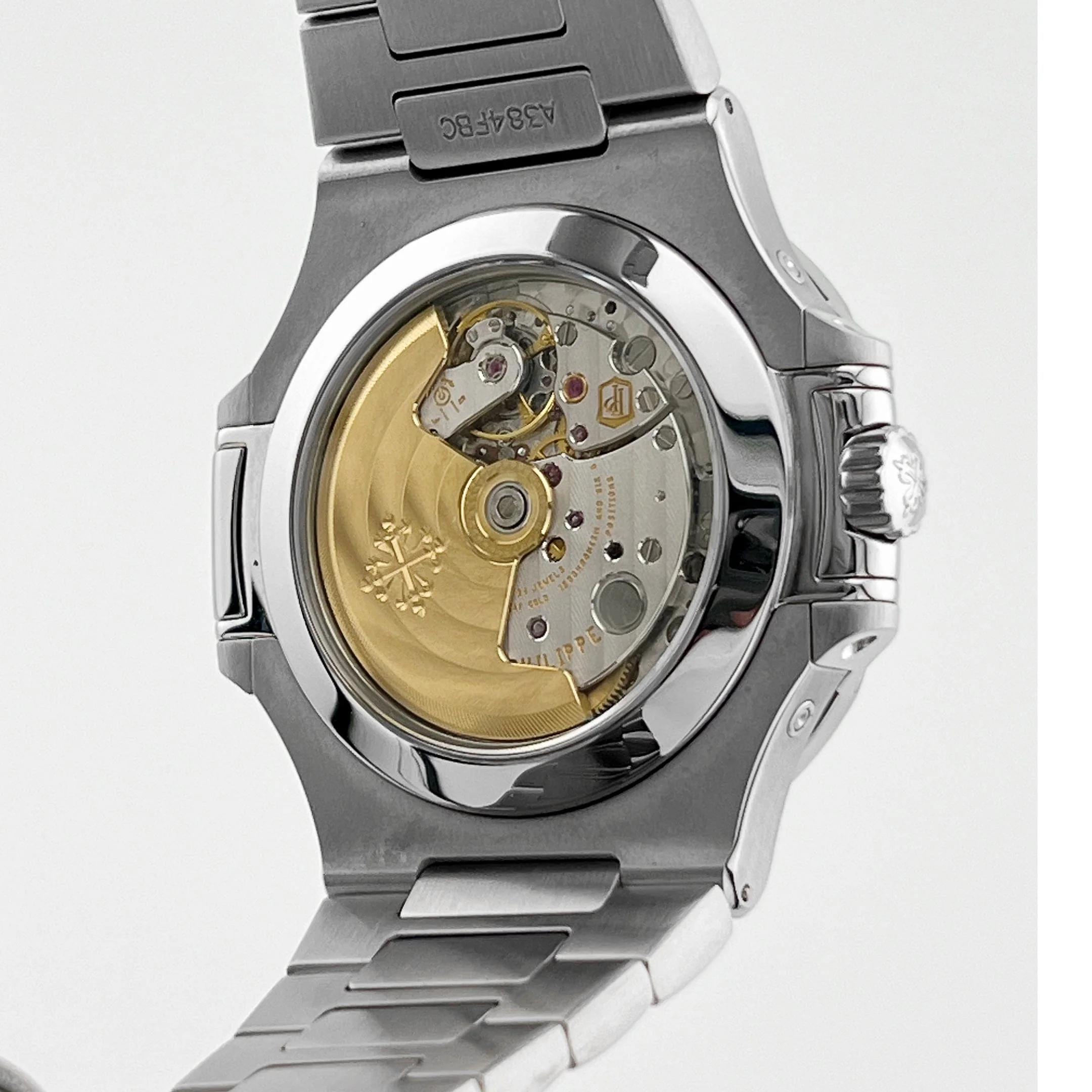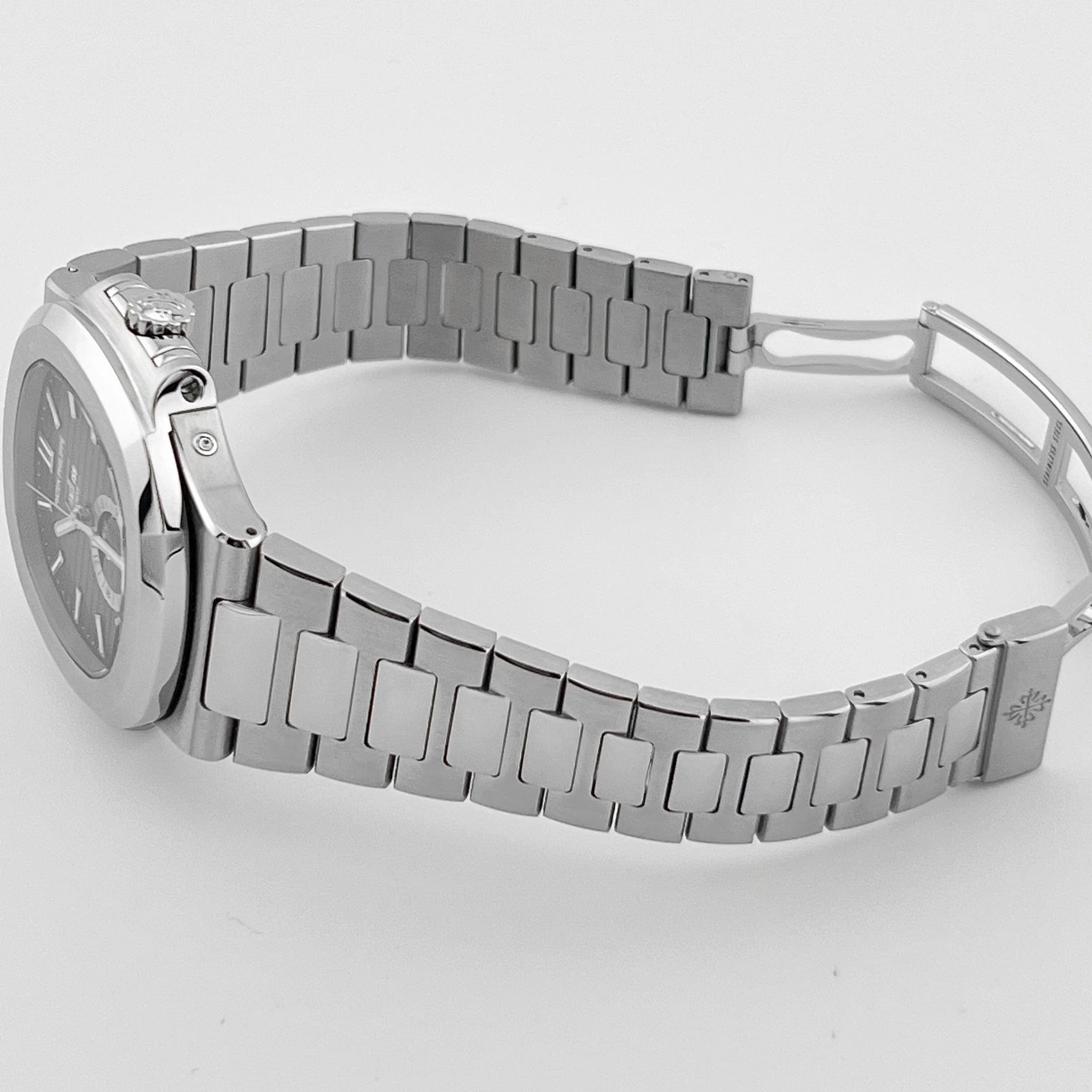 The Patek Philippe 5726/1A-001 is an exceptional blend of sporty design and sophisticated complications, making it a standout in the renowned Nautilus collection. Crafted in stainless steel, the 40.5mm case retains the iconic porthole-inspired silhouette, with a flawless mix of brushed and polished finishes that highlight its timeless appeal.