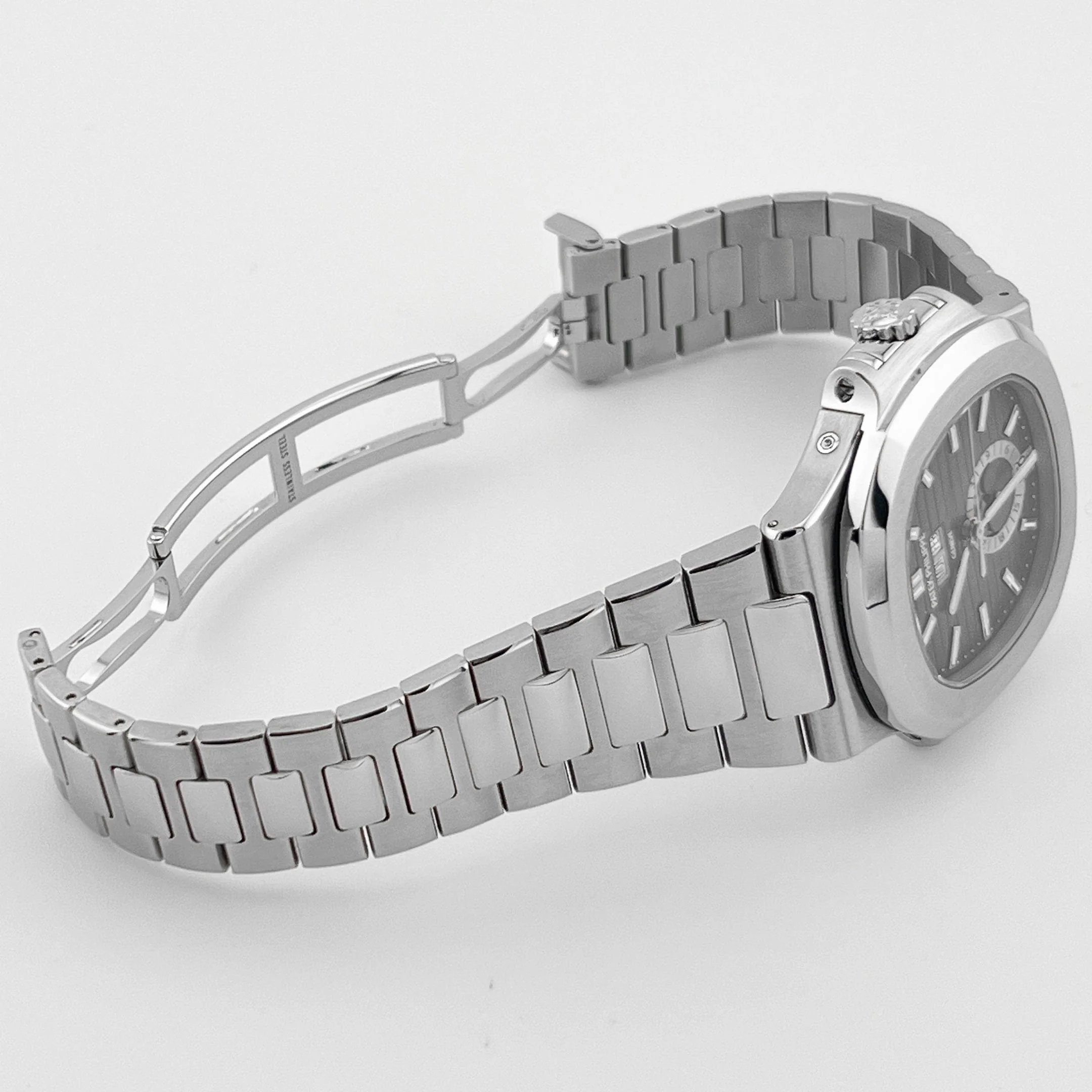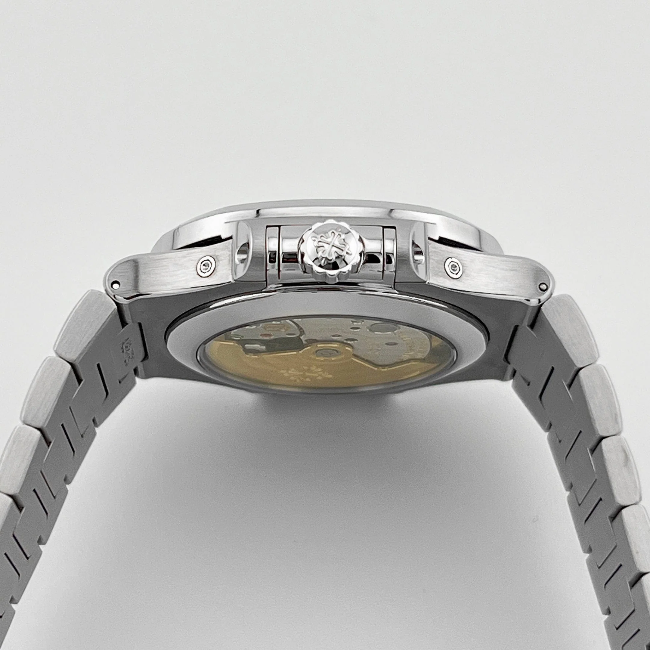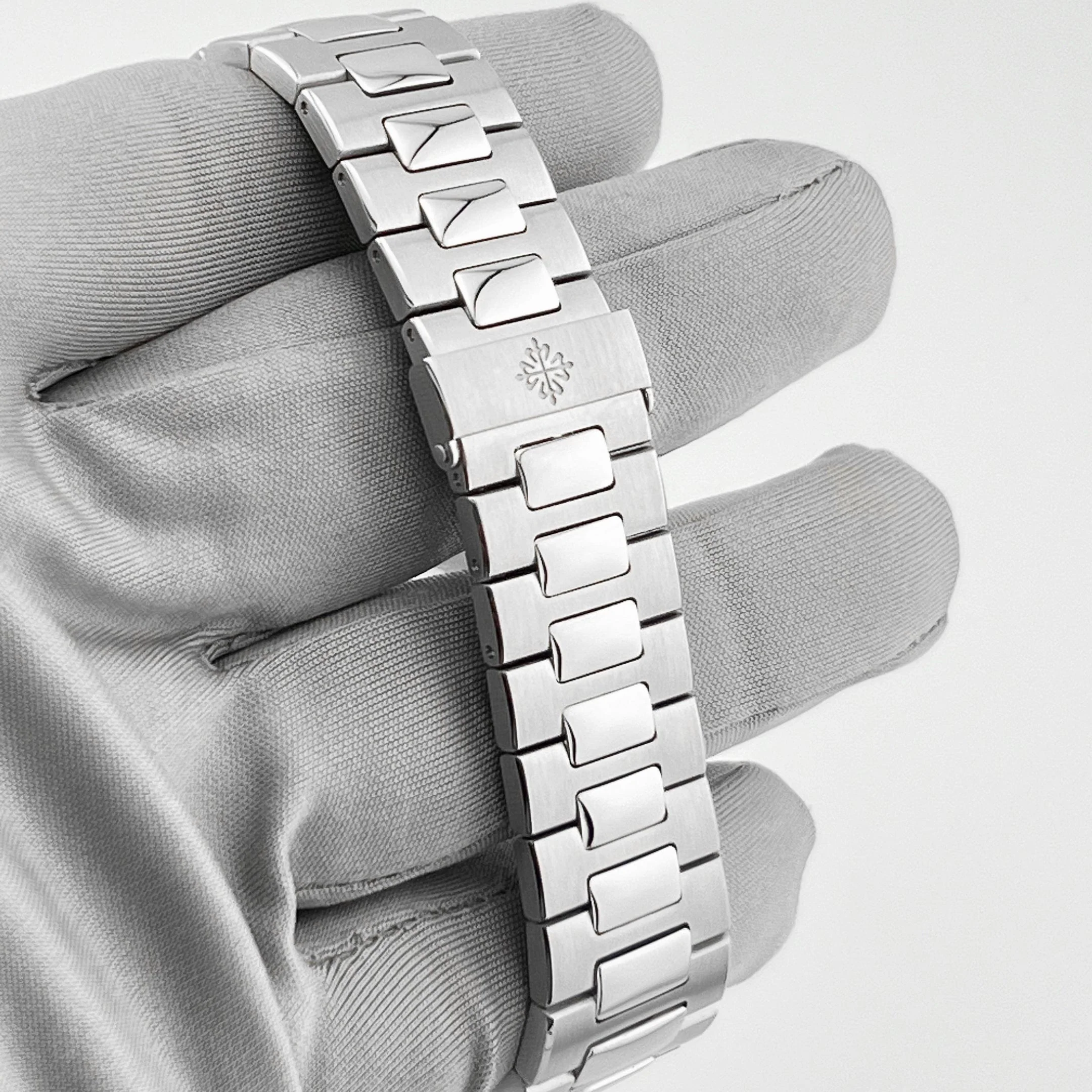 The Patek Philippe 5726/1A-001 is an exceptional blend of sporty design and sophisticated complications, making it a standout in the renowned Nautilus collection. Crafted in stainless steel, the 40.5mm case retains the iconic porthole-inspired silhouette, with a flawless mix of brushed and polished finishes that highlight its timeless appeal.